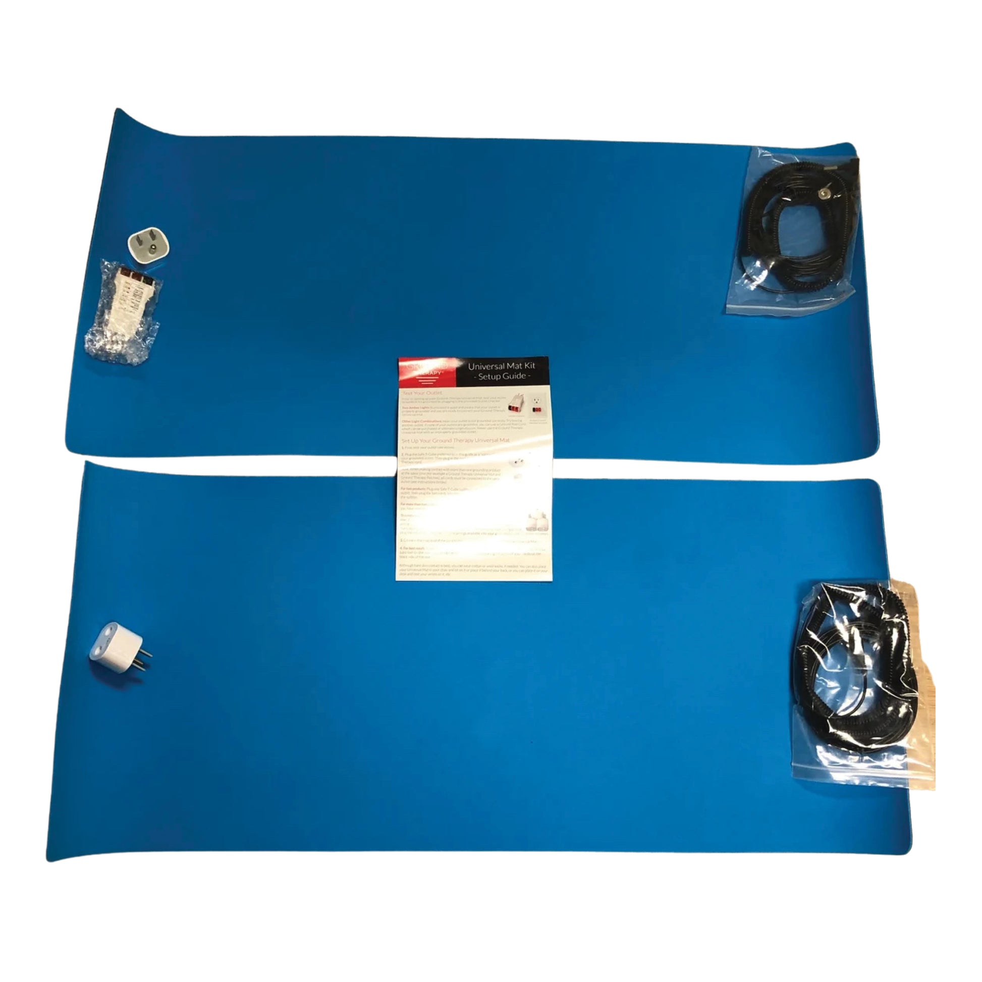 Universal Mat 2-Pack Kit includes: 2 Ground Therapy Universal Mats, 2 15' foot grounding cords, 2 Safe T Cubes, 1 outlet checker